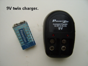 This is a twin charger , it can charge Ni-Cad or Ni-Mh 9 V batteries, two at a time. It has 16 mAh out put on each sucket. There is NO battery come with the charger. The charger's size is 3&1/4" L x 2&1/4" W x 2&1/4" H. Priced at $5.95 only . This charger is in stock.