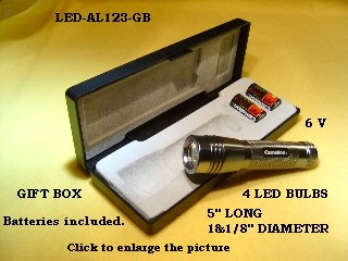- LED flashlight with 4 super bright LED bulbs (0.4W / 100.000 hours life span), powered by two CR123A batteries (Included), will provide 6 to 8 hours of light.