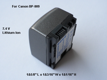 Empire Corp. made replacement battery for Canon BP-809, 7.4V , Lithium-ion battery , 800 mAh. 5.93 Wh. Dimensions - 1&5/8" L x 1 &3/16" W x 1&1/16" H. You will have one year's