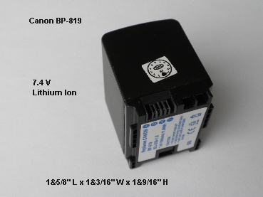 Empire Corp. made replacement battery for Canon BP-819 , 7.4V , Lithium-ion battery , 1600 mAh. Dimensions - 1&5/8" L x 1 &3/16" W x 1&9/16" H. This battery has the same application as BP808, but taller. The operating time of this battery time will be twice longer than BP808. Your charger will charge this battery. Priced at $52.95.