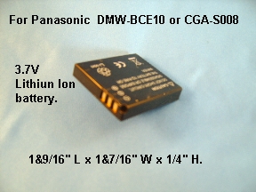 for your Panasonic camera battery, CGA-S008, CGR-S008, DMW-BCE10. It is fully compatible with your original equipment, Your original charger will charge this battery.