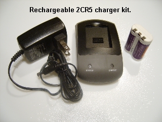 This is a 6 V rechargeable Lithium Ion battery kit, it comes with one charger , The charger will work under 110V and 240V. Plus a rechargeable 600 mAh 2CR5 Lithium Ion battery . It will need 3&1/2 hours to charge one battery. The product is made by Lenmar Inc. Priced at $25.95, You will have one year's