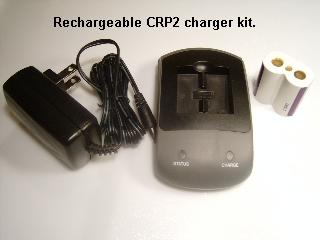 This is a 6 V rechargeable Lithium Ion battery kit, it comes with one charger , The charger will work under 110V and 240V. Plus a rechargeable 600 mAh CRP2 Lithium Ion battery . It will need 3&1/2 hours to charge one battery. The product is made by Lenmar Inc. Priced at $32.95, S&H are included. You will have one year's