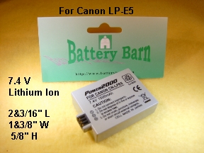 1500 mAh capacity, Made by VidPro Inc. , a replacement battery for Canon LP-E5, It shares the same dimensions with the original Canon LPE5 battery, ( 2&3/16" L x 1&3/8" W x 5/8" H.) Your original Canon charger will charge this battery, Priced at $19.95.