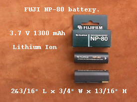 1400 mAh capacity, This battery is made by Vidpro Inc, It has the same Dimensions as FUJI made NP80 battery. (It works for some Kodak cameras too.) Priced at $11.95 only, IN STOCK.