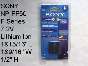 This battery is NOT made by Sony, it is made by Vidpro Inc. 7.2 V , 800 mAh capacity. It shares the same Dimensions with NP-FF50. Your SONY equipment will work with this battery just fine, shows all the information on your screen, your original charger will charge this battery as well. Priced at $23.95, plus shipping.