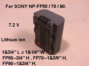 This is a SONY made battery for SONY Camcorder. 7.2 V , 1800 mah. Improved version from NP-FP70, This battery has more than twice the capacity than NP-FP50. The height of the battery is 1&3/8". You will have one year's