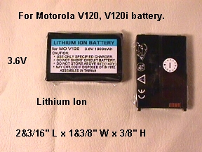 3.6V 1000 mAh Lithium Ion battery . 270 min. talking time. 300 hrs. stand-by time. Dimensions at--2&3/16" L x 1&3/8" W x 3/8" H. The battery is made by CTA Inc. Priced at $17.95. One years'