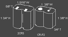 3V----$3.95; Made by Sanyo,The same battery as Duracell DL-CR2B. Dimensions--1&1/16" L x 5/8" D, Battery Barn Stock No. CR2-B